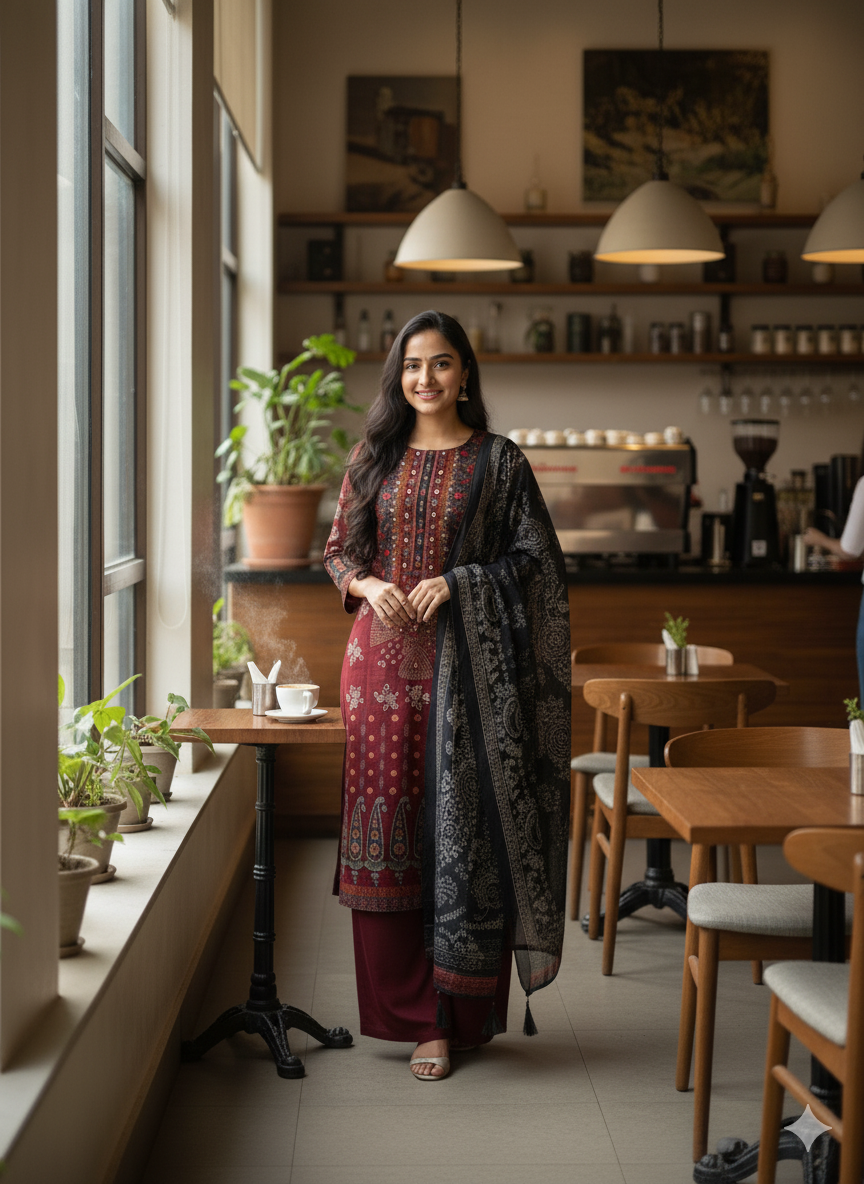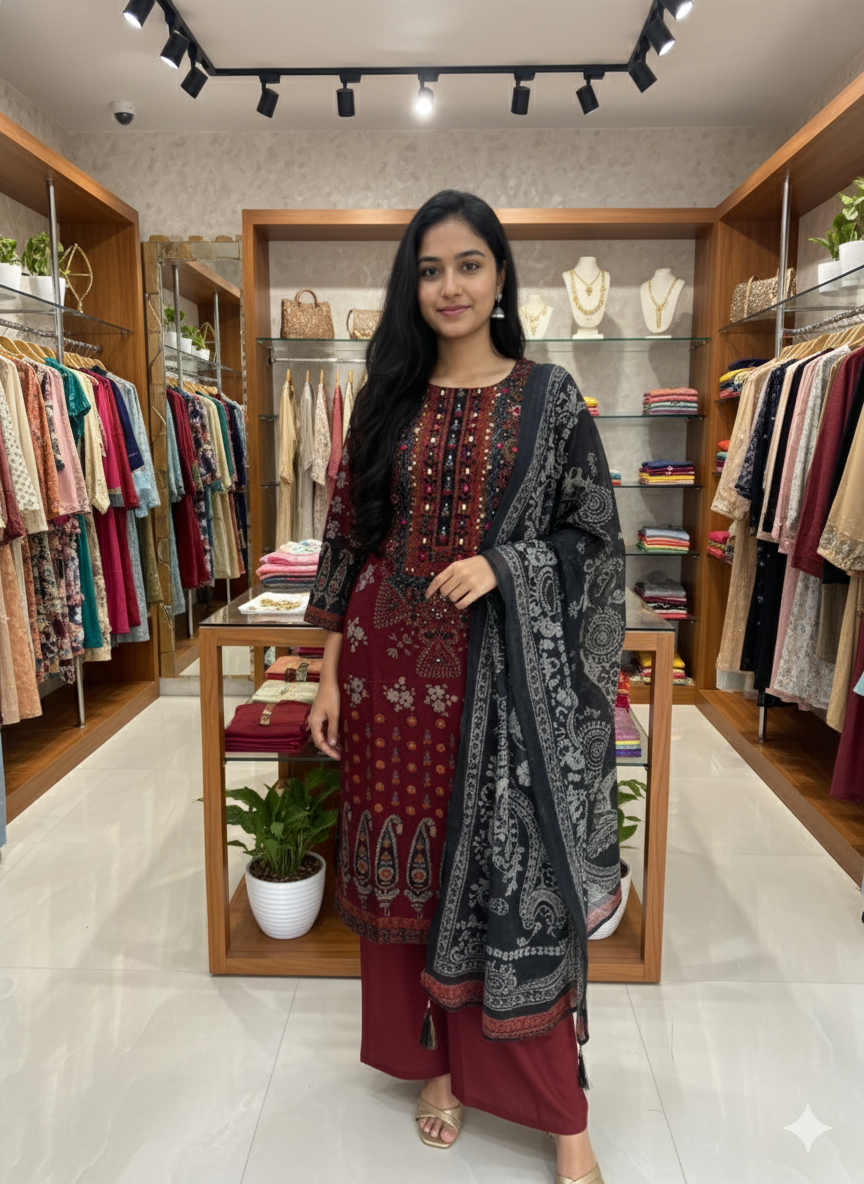 Step into sophisticated style with our beautiful Brick Red Printed Rayon Suit Set. Crafted from soft and comfortable rayon fabric, this three-piece ensemble is perfect for festivals, office wear, or stylish everyday occasions.