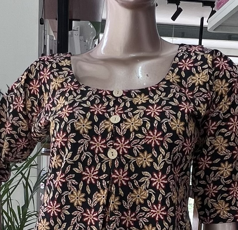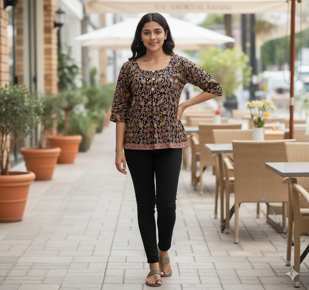 The round neckline, wooden-style front buttons, and half sleeves make it perfect for both casual outings and semi-formal occasions. The multicolor floral pattern over a classic black base gives it a chic and timeless look.