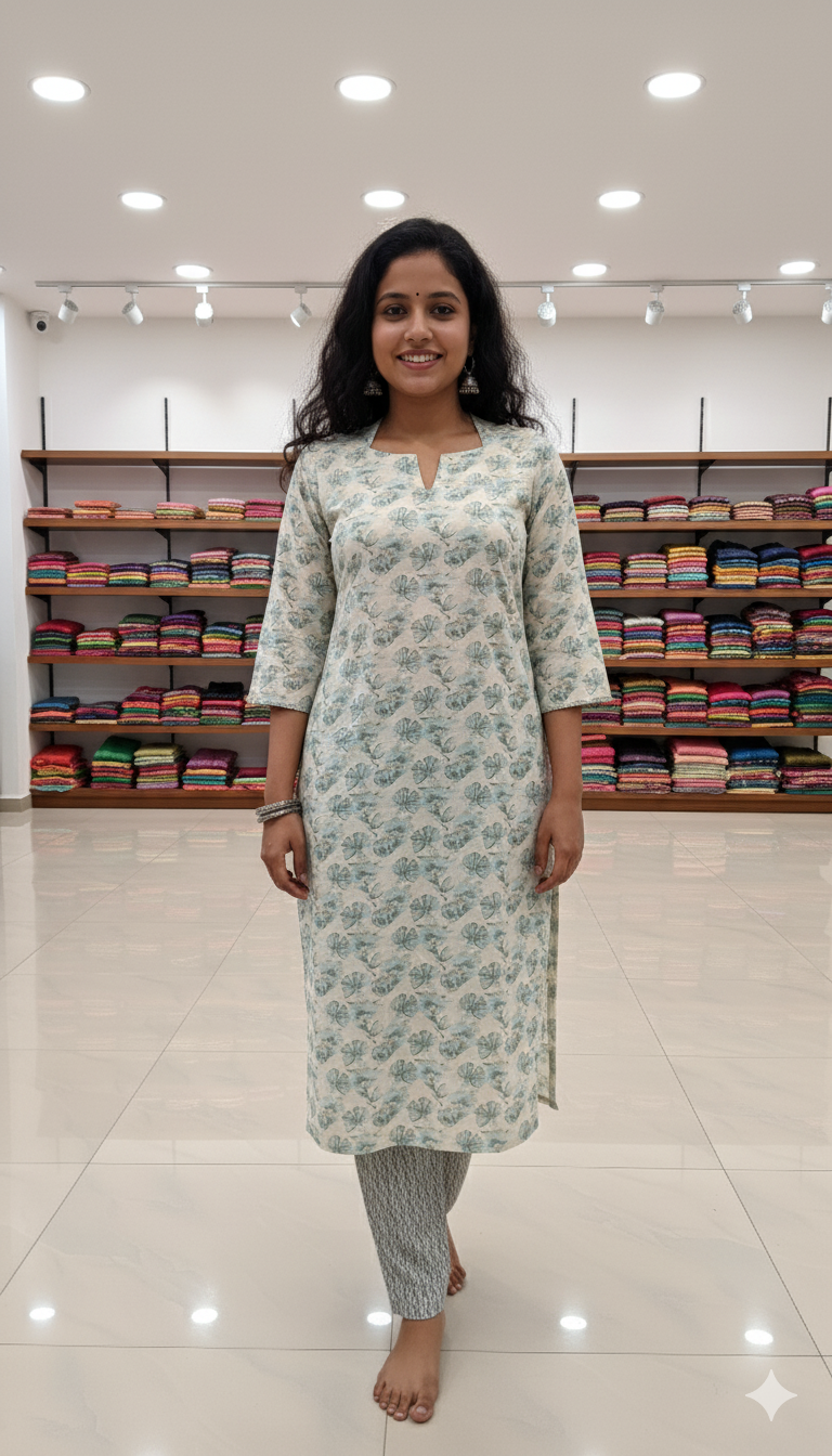 Step out in comfort and style with this elegant Kurti and Pant set. Crafted from soft, breathable cotton, the Kurti features a beautiful sky-blue floral/leaf print on an off-white base, making it perfect for daily wear, casual outings, or office wear. Pant included.