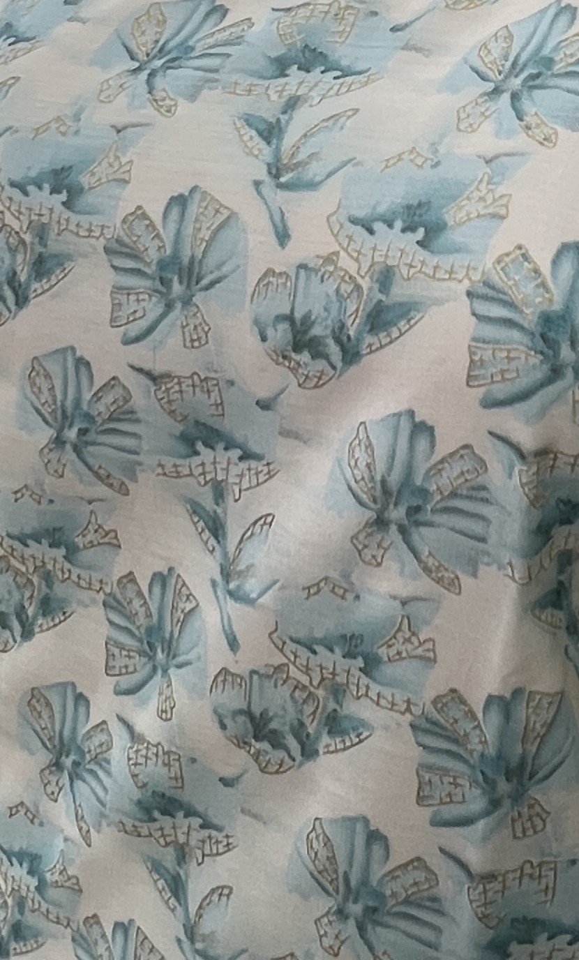 • Color & Print: Subtle off-white base with an all-over intricate print in a soft sky-blue/teal shade. The print appears to be a stylized floral or leaf pattern.