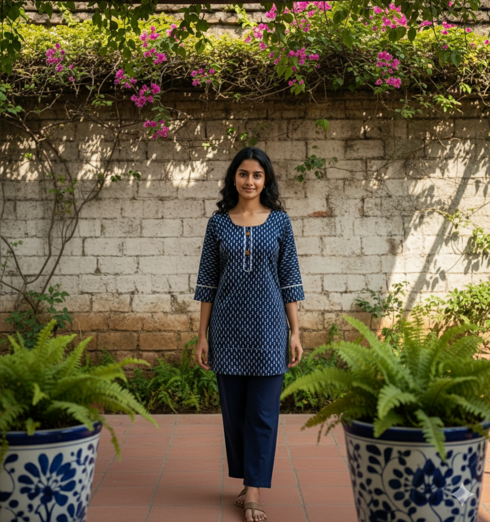 Ideal for pairing with leggings, palazzos, or cigarette pants, this kurti effortlessly blends traditional design with modern simplicity. Whether you’re heading to the office or enjoying a relaxed day out, this Navy Blue Printed Cotton Kurti ensures you look graceful and feel comfortable at every moment.